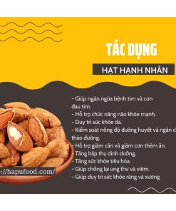 Hạnh nhân là loại hạt dinh dưỡng, có thể được dùng để ăn vặt hoặc sử dụng để làm bánh, sữa hoặc nhiều món ăn hấp dẫn khác. Hạnh nhân rang bơ đến từ thương hiệu Hapufood đặc biệt có hương vị thơm ngon, béo ngậy, tuyệt đối đảm bảo Vệ sinh an toàn thực phẩm do quy trình nhập khẩu và đóng gói khắt khe.