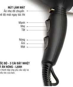 Khớp xoay 360 độ Khi bạn lắp đầu sấy vào thân máy sấy tóc, bạn có thể tự do điều chỉnh góc xoay theo ý muốn, giúp bạn có thể cố định kiểu tóc của mình một cách thuận tiện nhất. Đầu sấy dẹt giúp tóc thẳng và mềm hơn Đầu sấy dẹt dễ dàng làm mượt tóc, nhanh chóng giúp tạo kiểu cho tóc, giảm xoăn cứng, giúp tóc bạn đẹp hơn mỗi ngày. Dễ dàng tháo lắp và làm sạch. Lưới kép an toàn, ngăn tóc bị hút vào ống dẫn, giữ cho máy sấy luôn hoạt động hiệu quả, dễ lau chùi, bền khi sử dụng. Vòng treo tường thuận tiện Đuôi của máy sấy tóc được trang bị một chiếc móc, thuận tiện cho bạn treo máy sấy tóc khi không sử dụng đến, rất thuận tiện để cất giữ sản phẩm một cách gọn gàng. 2 tốc độ 3 cài đặt nhiệt Nút ấn nóng & lạnh. Hoàn thành đáp ứng yêu cầu sấy và tạo kiểu tóc của bạn.