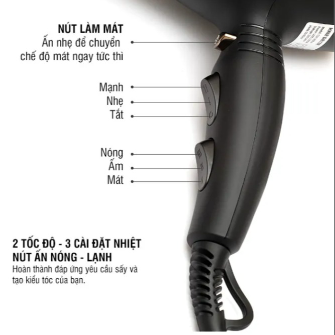 Khớp xoay 360 độ Khi bạn lắp đầu sấy vào thân máy sấy tóc, bạn có thể tự do điều chỉnh góc xoay theo ý muốn, giúp bạn có thể cố định kiểu tóc của mình một cách thuận tiện nhất. Đầu sấy dẹt giúp tóc thẳng và mềm hơn Đầu sấy dẹt dễ dàng làm mượt tóc, nhanh chóng giúp tạo kiểu cho tóc, giảm xoăn cứng, giúp tóc bạn đẹp hơn mỗi ngày. Dễ dàng tháo lắp và làm sạch. Lưới kép an toàn, ngăn tóc bị hút vào ống dẫn, giữ cho máy sấy luôn hoạt động hiệu quả, dễ lau chùi, bền khi sử dụng. Vòng treo tường thuận tiện Đuôi của máy sấy tóc được trang bị một chiếc móc, thuận tiện cho bạn treo máy sấy tóc khi không sử dụng đến, rất thuận tiện để cất giữ sản phẩm một cách gọn gàng. 2 tốc độ 3 cài đặt nhiệt Nút ấn nóng & lạnh. Hoàn thành đáp ứng yêu cầu sấy và tạo kiểu tóc của bạn.