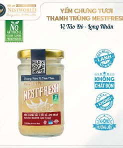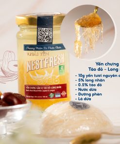 Nestfresh Vị Táo Đỏ – Long Nhãn 100ml: 10g Yến Việt sợi tươi nguyên chất, 80% nước dừa tươi, 1.5% đường phèn, 0.5% táo đỏ, 5% long nhãn các nguyên liệu thiên nhiên.