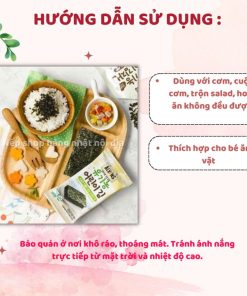 Rong biển ăn liền cán dẹt, giòn, thơm. Phù hợp ăn với cơm, hay nắm cơm cho bé cầm, ăn vặt như snack, .. ăn dặm vô tư do không thêm muối ngoài vị tự nhiên của rong ( giống tảo kombu nấu dashi có vị tự nhiên).