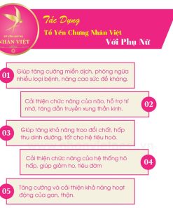 – Sử dụng Tổ yến sào chưng thường xuyên không những giúp phụ nữ tăng cường sức khoẻ mà còn cải thiện làn da trắng đẹp, giảm thâm nám và làm chậm quá trình lão hoá da,…..
