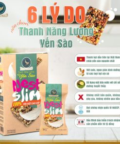 Đặc biệt, Nest Slim là thanh năng lượng đầu tiên trên thị trường có chứa yến sào nguyên chất, giúp bạn thưởng thức một món ăn nhẹ lành mạnh, đồng thời cung cấp đủ năng lượng cho cơ thể mà không lo dư thừa calo. Thích hợp cho những người chơi thể thao, cần năng lượng cho hoạt động thể chất hay đơn giản là một món ăn bổ dưỡng trong ngày.