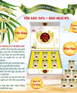 - Thành phần: Yến sào 36%, Bào ngư 8%, Sụn vi cá mập 5%, canxi từ tảo do 10%, duong isomalt, đường phèn, kali sorbat, nước tinh khiết.