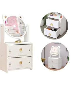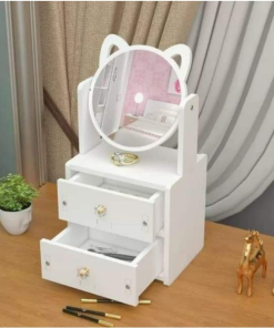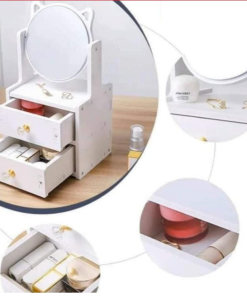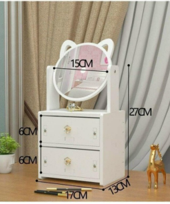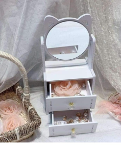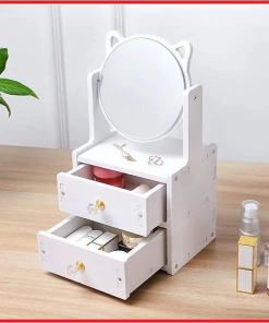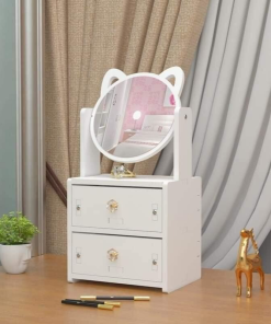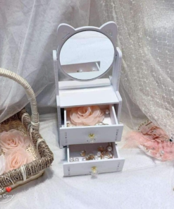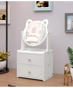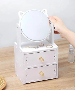 Kệ Trang Điểm Gương Tròn 2 Ngăn Kéo – Kệ Mỹ Phẩm Gỗ Kèm Gương Tai Mèo 2 Tầng – Tủ mỹ phẩm mini có gương tai mèo