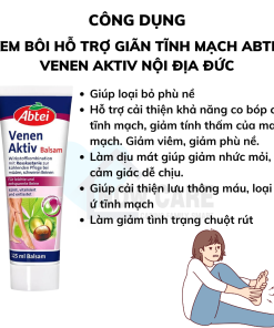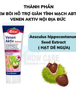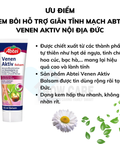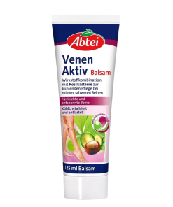 - Kem bôi hỗ trợ giãn tĩnh mạch Abtei Venen Aktiv Balsam là sản phẩm hỗ trợ cho người suy giãn tĩnh mạch của hãng Abtei Đức, được chiết xuất từ các thành phần nhiên nhiên, bôi ngoài da, dễ dàng hấp thu. Tinh chất của hạt dẻ ngựa giúp hấp thu dịch viêm, máu tụ, hoà tan các cục máu đông rất nhỏ ở các mạch máu bị phá hủy giúp làm lành vết thương, hỗ trợ làm vững thành mạch.