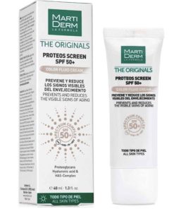- Kem Chống Nắng MartiDerm The Originals Proteos Screen SPF50+ Fluid Cream dạng lỏng dễ hấp thụ với chỉ số SPF 50+ giúp chống nắng cho da. Sản phẩm chống lại các tia UVA, UVB, IR (hồng ngoại), HEV (ánh sáng xanh). Sự kết hợp của Proteoglycans, Spectrum Complex, phức hợp Hyaluronic Acid & Silicon Complex giúp giữ cho làn da trẻ trung, tươi tắn và đều màu. Kết cấu dạng cream-to-powder độc đáo mang lại cảm giác mượt mà, mỏng nhẹ tựa "vô hình" trên da, lý tưởng dành cho mọi loại da khi sử dụng hằng ngày.