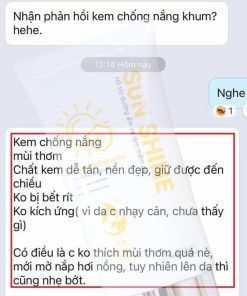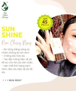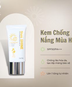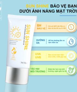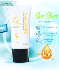 - Kem chống nắng 50gr Sun Shine được kết giữa công thức độc đáo và công nghệ hiện đại, cho ra một sản phẩm kem mềm mịn, thẩm thấu nhanh và tạo ra một lớp bảo vệ da hiệu quả.
