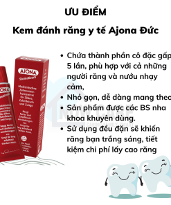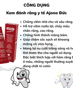 - Kem đánh răng Ajona Stomaticum khắc phục viêm nướu, chảy máu chân răng, ngăn ngừa hình thành cao răng, là sản phẩm được khuyên dùng trong nha khoa. Với thành phần cô đặc gấp 5 lần, kem đánh răng Ajona Stomaticum được các nha sĩ khuyên dùng để hỗ trợ gián tiếp khắc phục các vấn đề về nha khoa như viêm nướu (lợi), chảy máu chân răng, ngăn ngừa hình thành cao răng.