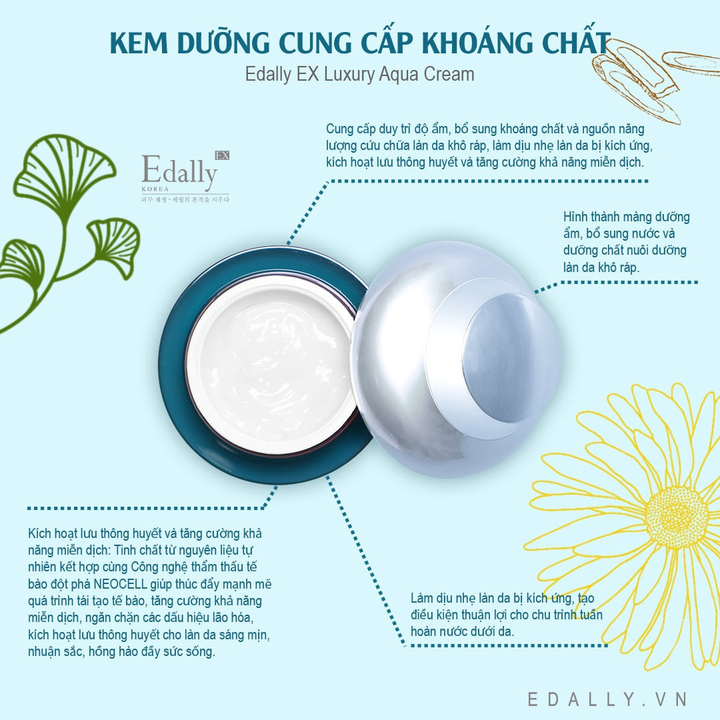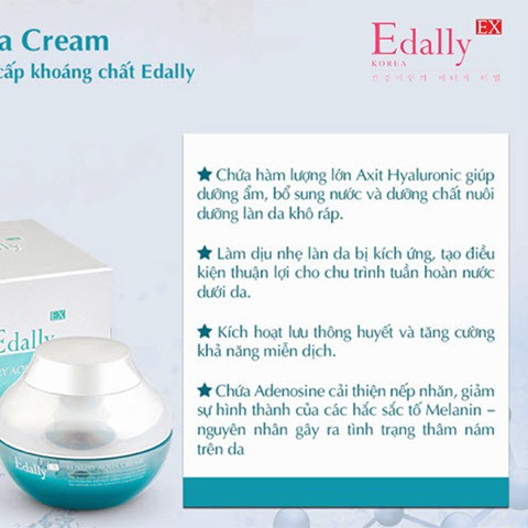 – Kem dưỡng cung cấp khoáng chất Edally EX với các thành phần tự nhiên như Axit Hyaluronic, rau má, cam thảo, hoa cúc, … mang đến giải pháp bổ sung nước và dưỡng chất, đánh thức làn da khô ráp, nhăn nheo thiếu sức sống, để làn da trở nên tươi sáng, căng mịn trẻ trung.
