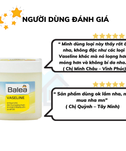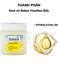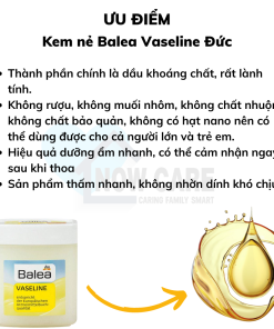 - Kem nẻ Balea Vaseline được sản xuất tại Đức với thành phần chính là dầu khoáng chất lấy từ khoáng sản tự nhiên có trong lòng đất, không lẫn tạp chất nên rất lành tính với hiệu quả trên cả những vùng da khô ráp như khuỷu tay, đầu gối, mắt cá, gót chân… Giúp làm mềm lớp sừng và lành các vết thương ngoài da do bị khô nứt nẻ vào mùa đông, da sẽ mềm mại hơn và được giữ ẩm tốt dù thời tiết khô lạnh. Thành phần sản phẩm không có cồn, không có muối nhôm, không có chất nhuộm, không có chất bảo quản, không có hạt nano, không có paraben và thuần chay.