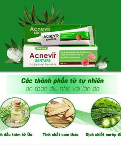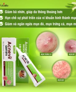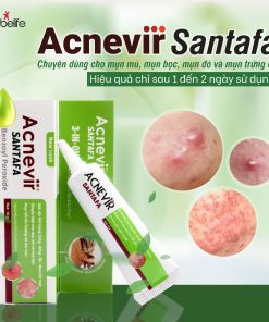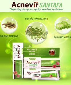 - Kem mụn Acnevir Santafa xanh là sản phẩm giảm mụn với các thành phần từ tự nhiên an toàn dịu nhẹ với làn da. Là sản phẩm chuyên dùng cho các loại mụn mủ, mụn bọc, mụn đỏ và mụn trứng cá. Hiệu quả nhanh chóng chỉ sau 1 đến 2 ngày sử dụng.