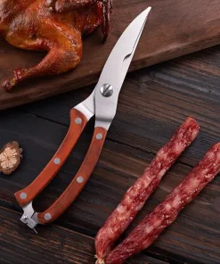 Kéo cắt gà có móc khóa tay cầm, có phần lưỡi kéo cong; sắc bén; kèm theo lẫy tạo lực đẩy vừa đủ để bạn có thể dễ dàng cắt rời các loại thực phẩm: thịt gà; thịt vịt; cá…còn sống hoặc đã qua chế biến.