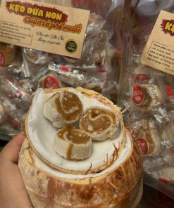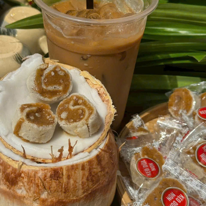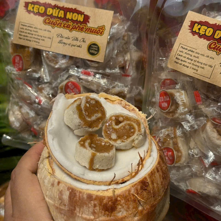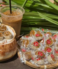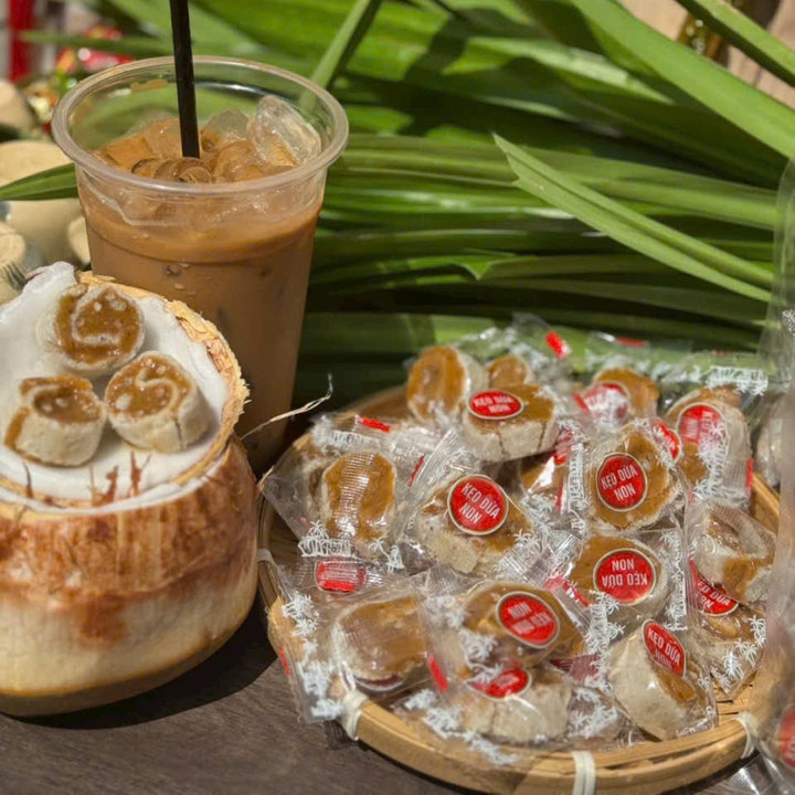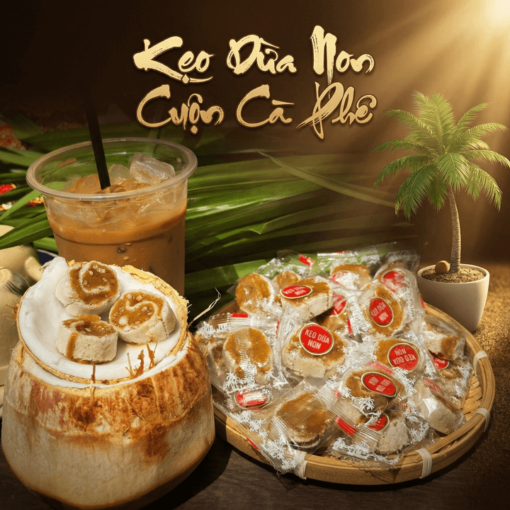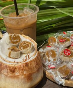 Kẹo dừa non cuộn cà phê với lớp dừa non mềm dẻo, béo nhẹ tự nhiên, kết hợp hương cà phê rang thơm dịu.