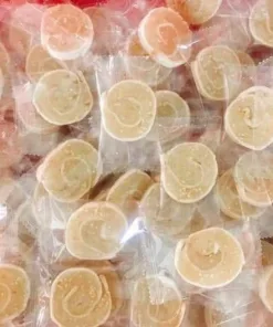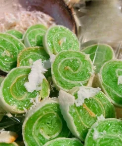 👉 Kẹo dừa non cuộn dẻo bọc bên ngoài lớp bánh tráng nướng giòn giòn rất ngon.