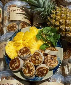 🔆Bên trong với nhân khóm dẻo dẻo, chua chua, ngọt ngọt hòa cùng với vị bùi béo của đậu phộng, tắc, mạch nha, mè và bên ngoài cuộn một lớp bánh tráng chắn chắn sẽ làm hài lòng ngay cả những khách hàng khó tính nhất.