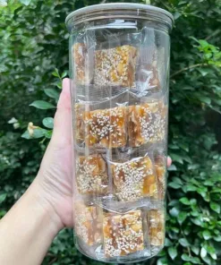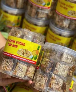 Món này nói thiệt hông ăn là có lỗi với cái bụng lắm nghen, kẹo khóm nghe thường thường nhưng mỗi lò mỗi cách làm khách nhau. Em thích ăn chua chua nên em đặt riêng làm theo khẩu vị chua ngọt, thêm độ béo của sợi dừa rám xen lẫn, bùi bùi của đậu phộng rang, thơm nhẹ của vỏ tắc cắt nhuyễn, cực kỳ bắt miệng. Món này mình ăn chơi uống trà hay đem đi du lịch đem theo đỡ buồn miệng.