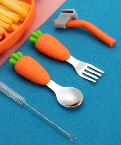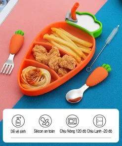 Bộ sản phẩm gồm: 1 khay ăn 3 ngăn hình carot, 1 thìa, 1 dĩa inox, 1 ống hút