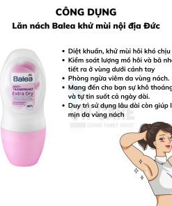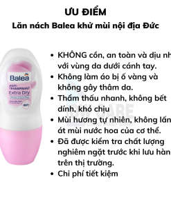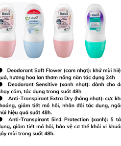 - Lăn khử mùi Balea với công thức lành tính không chứa ethanol và paraben sẽ giúp bạn loại bỏ nhanh chóng mùi hôi khó chịu ở vùng nách, kiểm soát mồ hôi hiệu quả đồng thời ngăn ngừa vết ố vàng và mang đến cảm giác khô ráo suốt cả ngày. Sản phẩm có nhiều dòng với các tính năng và mùi hương khác nhau giúp mọi người có thêm nhiều sự lựa chọn.
