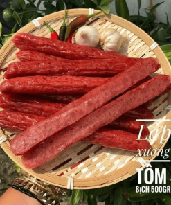 - Lạp xưởng Tôm được sản xuất từ những con Tôm Sú Vùng Vĩnh Châu, Sóc Trăng kết hợp với nạc đùi của Heo khoảng 3-4 tháng tuổi cùng với lớp mỡ bụng được lựa chọn kỹ càng sau đó được xay nhiễn và trộn với hương vị, gia vị theo công thức gia truyền.