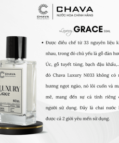 - Chava Luxury Grace N033 chính là một bản tuyên ngôn cho sự sáng tạo về mùi hương bởi những nét chấm phá riêng biệt qua mùi ám khói, đặc biệt chai nước hoa đẳng cấp này còn khơi dậy sự sống mãnh liệt của rừng già bạc ngàn với hàng niên kỷ.