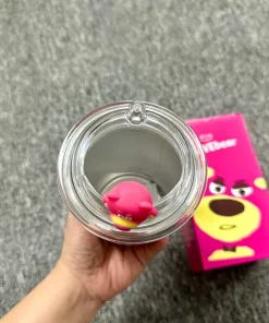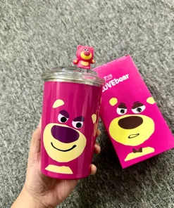 Trên ly in họa tiết gấu hồng lotso và gấu dâu cute cho học sinh, sinh viên hoặc dân văn phòng.
