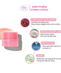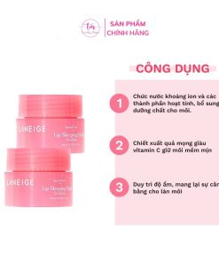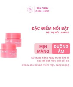 Mặt nạ môi Laneige Lip Sleeping Mask có tên gọi khác là mặt nạ ngủ cho môi. Với công nghệ độc quyền của laneige, sản phẩm giống sáp nhưng không dính chứa nhiều vitamin C, độ ẩm cao làm giảm da khô bong, dưỡng ẩm cho đôi môi luôn căng mọng.