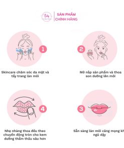 Trước khi ngủ, thoa một lượng nhiều lên môi để đánh tan các tế bào da chết cứng đầu. Cung cấp nguồn độ ẩm dồi dào cho da qua cả đêm.