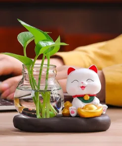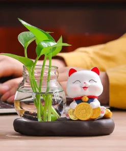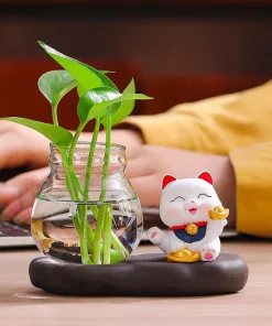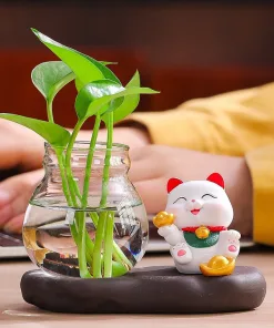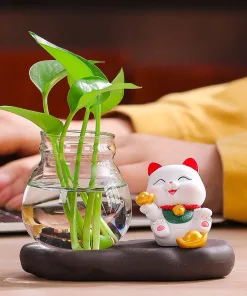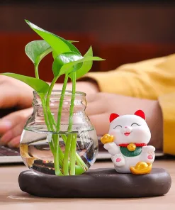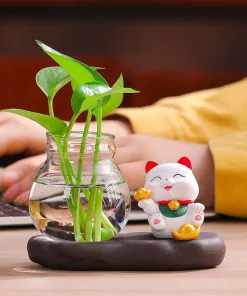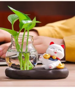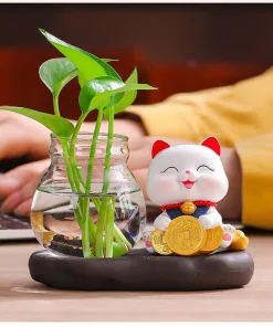 Bộ deocor Mèo thần tài may mắn kết hợp cùng bình thủy sinh đế gỗ trang trí nhà, bàn làm việc góc học tập giúp mang lại may mắn và thư giãn cho người sử dụng