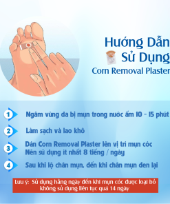 - Miếng dán loại mụn cóc Corn Removal Plaster với các thành phần an toàn và dịu nhẹ giúp giải quyết vấn đề mụn cóc trên hiệu quả, không gây đau rát, chảy máu. Corn Removal Plaster rất tiện dụng và dễ dàng sử dụng đối với mọi đối tượng.