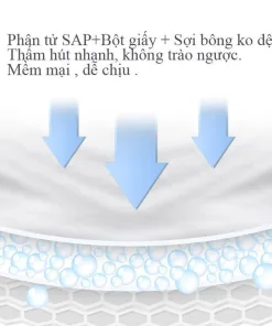 Thành phần: Polyolefin, Pulp tissue, Fluff pulp, Polyarylic acid, Sodium salt, Polyetthylene, Synthetic, Rubber hotlmelt, Silicone coated paper, Polyurethane, Polypropylene