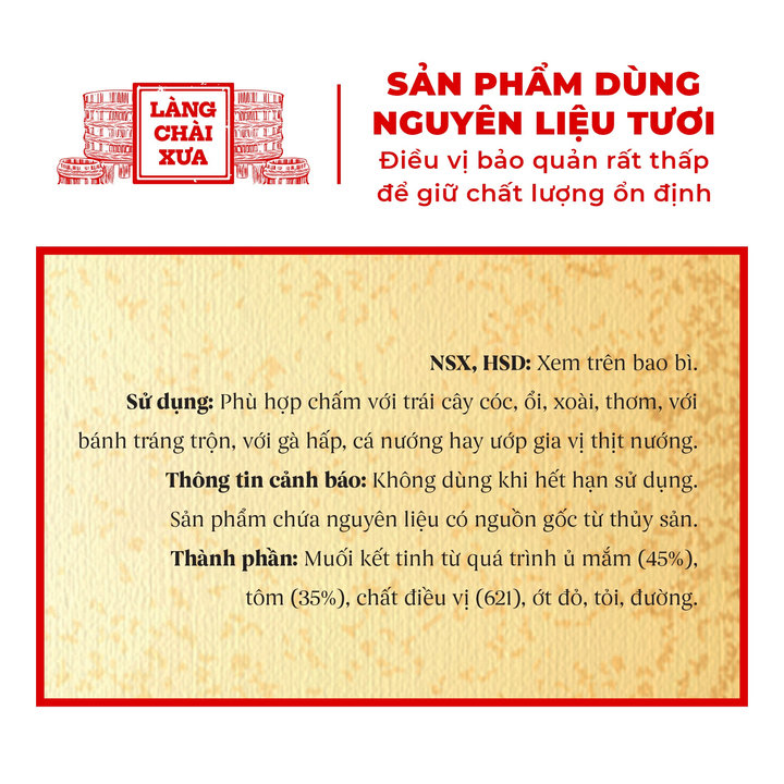 – Thành phần: Muối kết tinh từ quá trình ủ mắm (45%), tôm (35%), chất điều vị (621), ớt đỏ, tỏi, đường.