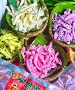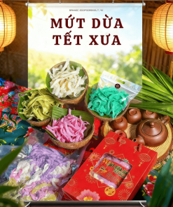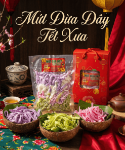 Mứt dừa dây vị Tết xưa, sợi dài mềm dẻo, béo thơm tự nhiên từ dừa bánh tẻ – dừa nám chọn lọc kỹ.