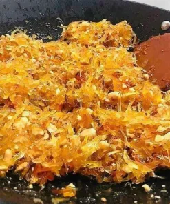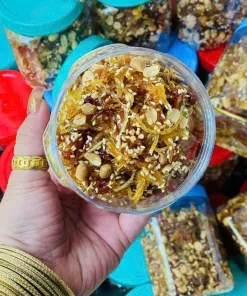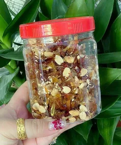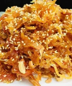 👉 Chuối Xiêm ép phơi khô rồi ngào cùng , gừng, tắc, đậu phộng, mè rang. Khoóm – cà