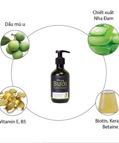- Thành phần: Tinh dầu Bưởi, chiết xuất Củ Cải Đường, dầu Mù U, chiết xuất cây Phỉ, chiết xuất Nha Đam tươi, Keratin, Biotin, Vitamin B5 và Vitamin E
