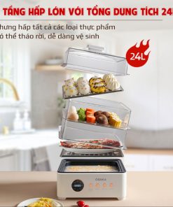 – Công dụng 2 : Có 3 tầng hấp cao 24L / chưng cách thuỷ phía trên để: Chưng , hấp tất cả các loại , thực phẩm, hải sản ….
