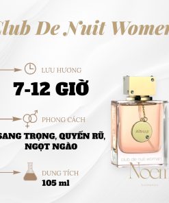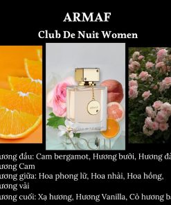 • Armaf Club de Nuit Woman có nốt hương mở đầu l cam bergamot, bưởi, đào. Nốt hương giữa là sự hòa trộn tinh tế của hoa phong lữ, hoa nhài, hoa hồng và vải thiều. Nốt hương cuối là hoắc hương, xạ hương, vanilla và cỏ vetiver. Hương thơm này được các chuyên gia đánh giá tương tự như đàn chị Chanel Coco Mademoiselle đã lừng danh bấy lâu nay với giá rẻ hơn rất nhiều.