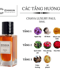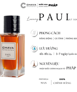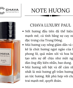 - Chava Luxury Paul là tinh thần phóng khoáng và hào sảng của một chàng trai Paris, Paul tinh chế hương thơm pha trộn một chút ngông nghênh, phong lữ nhưng không kém phần cuồng nhiệt, mê hoặc.
