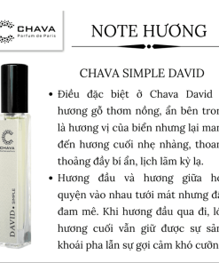 - Chava David là hương gỗ thơm nồng, ẩn bên trong là hương vị của biển nhưng lại mang đến hương cuối nhẹ nhàng thoang thoảng đầy bí ẩn, lịch lãm kỳ lạ.