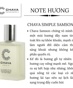 - Chava Samson chứng tỏ mình là một mùi hương đầy nam tính, toát lên sự khỏe khoắn mạnh mẽ làm người đối diện thấy sảng khoái nhưng không kém phần quyến rũ.