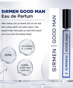 – SIRMEN GOOD MAN khép lại hành trình hương thơm với sự lưu luyến của rêu phong, gỗ tuyết tùng và xạ hương. Nốt hương có chiều sâu, lưu lâu, trầm ấm và nam tính này tạo nên ấn tượng khó phai, thể hiện sự trưởng thành và quyến rũ của phái mạnh.