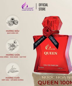 – Nước hoa nữ sang trọng, Charme Queen đại diện cho sự nồng nhiệt với một sự tươi mát “đầy phấn khích” và thành phần hoa mang cảm giác gợi cảm. Accord của hoa hồng giúp cho bạn trở nên quyến rũ mãnh liệt hơn bao giờ hết, với hỗn hợp của mâm xôi, mật ong và bổ sung thêm haze lnut sẽ tạo ra một mùi hương đầy lôi cuốn và quyến rũ