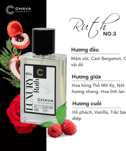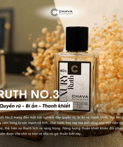 - Ruth No.3 mang đến một trải nghiệm đầy quyến rũ, bí ẩn và thanh khiết. Với tên gọi lấy cảm hứng từ sức mạnh nữ tính, chai nước hoa này tỏa ánh sáng như một viên ngọc quý, thể hiện sự thanh lịch và sang trọng. Năng luợng thuần khiết khiến đối phương muốn được che chở và bảo vệ cho cô gái thuần kiết này.