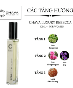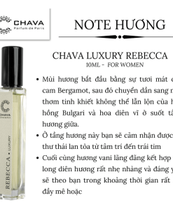 - Chava Luxury Rebecca có mùi hương hài hòa, thanh lịch và không kém phần sang trọng. Mùi hương dòng nước hoa này làm cho người ta mường tượng về những cánh đồng tươi mát chớm nở trong ánh bình minh.