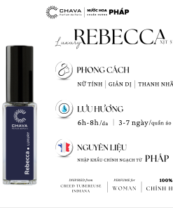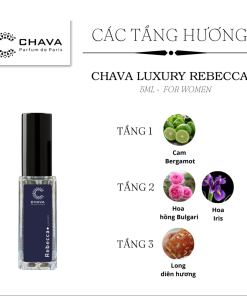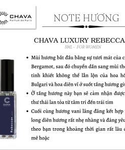 - Chava Luxury Rebecca có mùi hương hài hòa, thanh lịch và không kém phần sang trọng. Mùi hương dòng nước hoa này làm cho người ta mường tượng về những cánh đồng tươi mát chớm nở trong ánh bình minh.