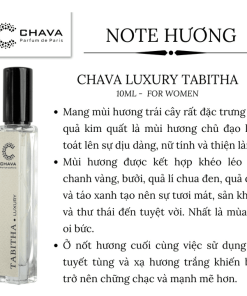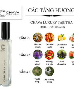 - Nốt đầu của Chava Luxury Tabitha là hương thơm tươi sáng trong lành rất đặc trưng của nhóm trái cây gồm chi cam chanh, quả kim quất và bưởi. Sự tinh tế nhẹ nhàng nốt hương này làm hài hòa khứu giác chỉ trong một thời gian ngắn, bởi sẽ nhường chỗ cho thành phần chủ đạo của tầng hương giữa là cảm hứng từ mùa xuân với các loài hoa trái: Hoa violet tao nhã, mùi hương dễ chịu ngọt thơm của quả đào, táo xanh và quả lý chua đen, tạo nên một chút cảm giác mềm mại khiến phái đẹp mê mẩn bởi sự thanh lịch nhưng cực kỳ thu hút và lãng mạn.