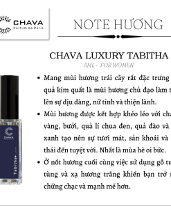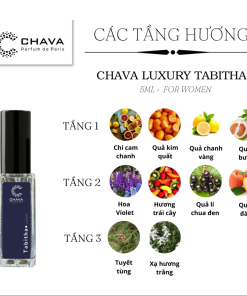 - Nốt đầu của Chava Luxury Tabitha là hương thơm tươi sáng trong lành rất đặc trưng của nhóm trái cây gồm chi cam chanh, quả kim quất và bưởi. Sự tinh tế nhẹ nhàng nốt hương này làm hài hòa khứu giác chỉ trong một thời gian ngắn, bởi sẽ nhường chỗ cho thành phần chủ đạo của tầng hương giữa là cảm hứng từ mùa xuân với các loài hoa trái: Hoa violet tao nhã, mùi hương dễ chịu ngọt thơm của quả đào, táo xanh và quả lý chua đen, tạo nên một chút cảm giác mềm mại khiến phái đẹp mê mẩn bởi sự thanh lịch nhưng cực kỳ thu hút và lãng mạn.