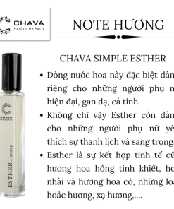 - Dòng nước hoa Chava Esther này dành riêng cho những người phụ nữ hiện đại, gan dạ, cá tính và cả phụ nữ yêu thích sự thanh lịch và sang trọng. Esther là sự kết hợp tinh tế của hương hoa hồng tinh khiết, hoa nhài và hương hoa cỏ, những loại hoắc hương, xạ hương…