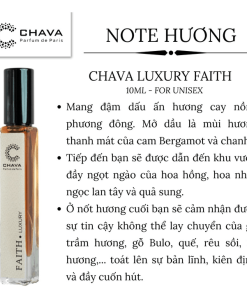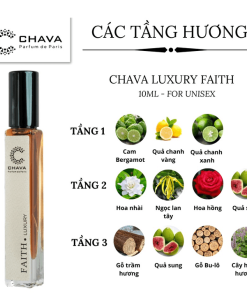- Khởi đầu của Chava Luxury Faith là hương vị tươi trẻ đầy hứng khởi đến từ cam Bergamot và chanh, hương liệu citrus này mang đến cảm giác đầy sảng khoái và mát mẻ. Đến lớp hương thứ hai, mùi hương êm dịu dần dẫn dắt bạn đến khu vườn đầy hương hoa, nào là hoa hồng, hoa nhài và cả hoa ngọc lan tây và quả sung, đây là một điểm nhấn khá đặc biệt, sự ngọt ngào pha chút ấm áp và muôn phần lôi cuốn.