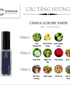 - Khởi đầu của Chava Luxury Faith là hương vị tươi trẻ đầy hứng khởi đến từ cam Bergamot và chanh, hương liệu citrus này mang đến cảm giác đầy sảng khoái và mát mẻ. Đến lớp hương thứ hai, mùi hương êm dịu dần dẫn dắt bạn đến khu vườn đầy hương hoa, nào là hoa hồng, hoa nhài và cả hoa ngọc lan tây và quả sung, đây là một điểm nhấn khá đặc biệt, sự ngọt ngào pha chút ấm áp và muôn phần lôi cuốn.